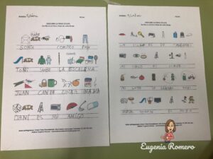 Con ella vais a trabajar la conciencia fonológica, porque para adivinar la frase oculta deben escribir la primera sílaba de cada uno de los pictogramas que aparecen. Para ello debemos trabajar antes la sílaba, y darles la consigna de que en las partes dónde hay 2 o 3 dibujos es porque esa palabra está formada por ese número de sílabas, y por tanto esa palabra la deben escribir junta.