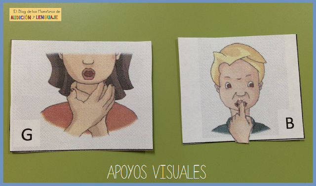 En esta ocasión, tengo una alumna de 1º de Educación Primaria que confunde a nivel escrito los fonemas /g/ y /b/, así que busqué las imágenes del método micho y adapté una de ellas, la de la /b/, cogí la mano de otra imagen, la recorté y se la puse encima de los labios porque a ella le viene mejor recordar que se hace juntando los labios.