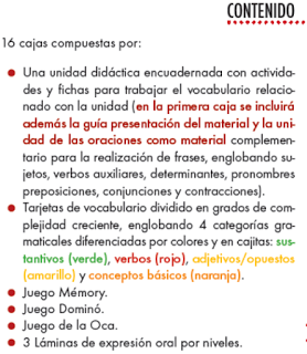 Justo hoy nos llegó el catálogo de GEU (que me encanta porque es material muy práctico), y mi compañera y yo nos pusimos a miralo como locas!!!Y nos fijamos en este material, y cada caja trae todo eso??puedes especificarlo mas? Veo una lámina, cartas de sustantivos, para hacer oraciones…