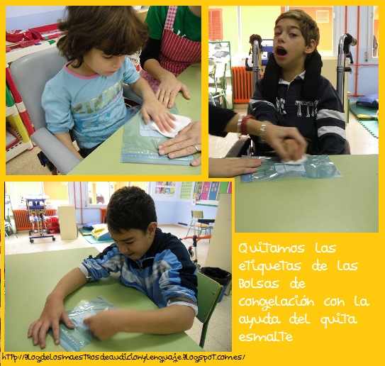Primero de todo quitamos con la ayuda del quita esmalte la etiqueta que viene en las bolsas de congelación. Se han quedado un poco asombrado al ver con la facilidad que hacíamos “magia” y borrábamos la etiqueta blanca 🙂