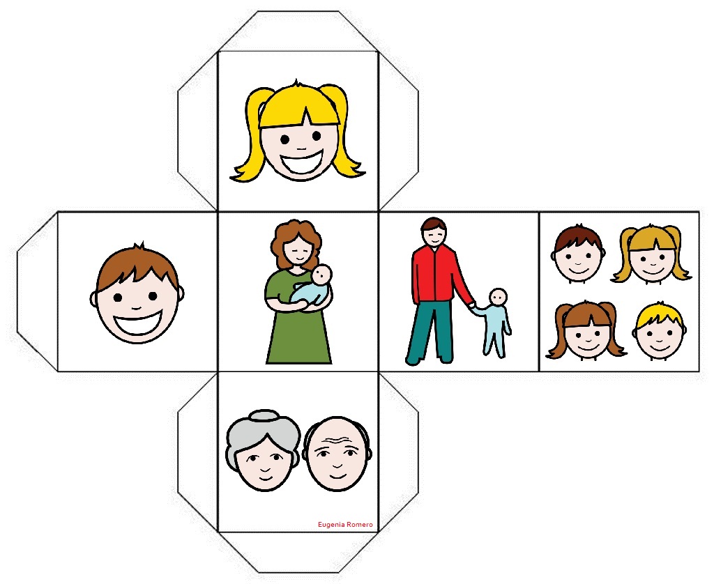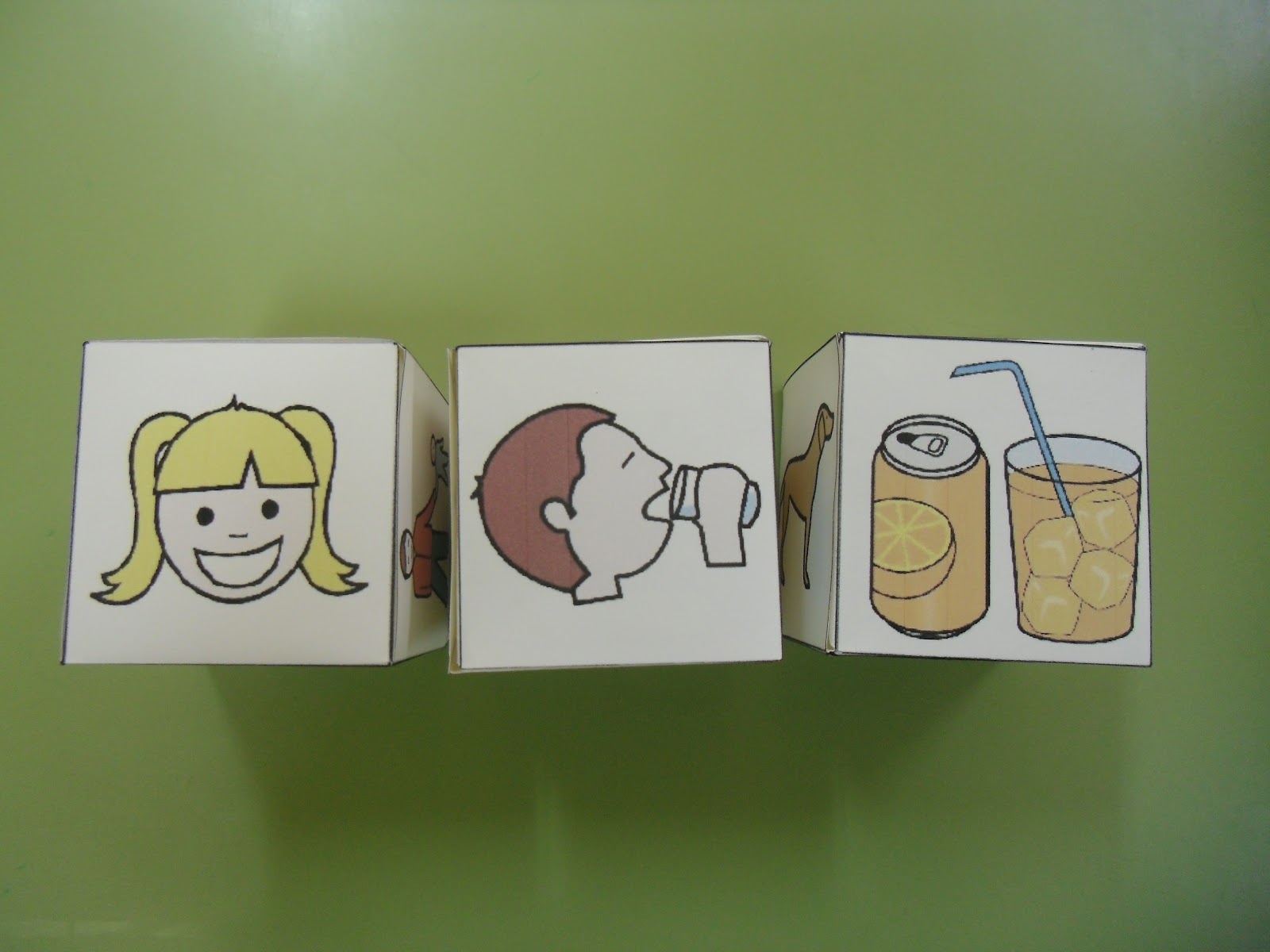 Elaboración: Abrimos el programa “Paint” y colocamos las imágenes que queremos en nuestras caras de cada dado, acordaros que hay que reducir los pictogramas hasta que encajen en los cuadrados. Haremos uno para los sujetos, otro para los verbos y otro para los complementos directos. Una vez finalizado, imprimimos en cartulinas los dados, los recortamos y montamos con ayuda del pegamento.