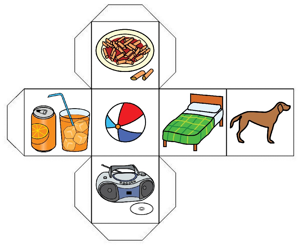 Materiales necesarios: Cartulina, una plantilla de un dado (la encontráis en google), pictogramas de ARASAAC, pegamento y tijeras.