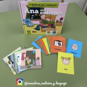 Cada caja contiene el cuento (21×20 cm) con la imagen en la parte izquierda y en la derecha los pictogramas en SPC, una pequeña guía dentro del cuento, unas láminas del cuento adicionales en un formato más pequeño (10×11 cm), y los pictogramas por separado en SPC.