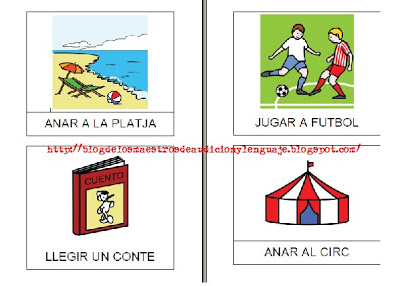Para los alumnos que tienen bastantes dificultades para expresarse, ya sea por trastornos del lenguaje, por situaciones de bilingüismo, porque tenga una deficiencia psíquica, etc, podemos ayudarles, y a la vez reforzar a los demás, con imágenes. Yo las he realizado para un alumno de 1ºEP que tiene síndrome de down, y nos da buenos resultados (claro que la familia nos ayuda, y nos ponen por escrito en la agenda si han hecho algo especial). Como siempre los he realizado con pictogramas de ARASAAC, están en catalán pero os dejo el documento en word para que lo podáis traducir al castellano, y bueno, y asi ya tenéis algo de trabajo avanzado.Yo las he recortado y plastificado, y las uso con una pizarra pequeña, las engancho con blu-tack, pero también les podéis poner velcro.