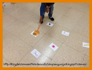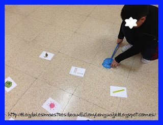 Y bueno, mi versión de hoy ha sido JUEGA A ATRAPAR EL FONEMA /R/ O /RR/. Antes he trabajado la diferencia entre uno y otro, que uno tiene el sonido suave y el otro fuerte, aprovechando los colores repartimos el “matamoscas” de color azul para los dibujos que correspondieran a la R fuerte y el de color naranja para la R floja. Y nada, a atrapar fonemas!! yo le iba diciendo cada vez si tenían que buscar una floja o una fuerte. Les ha gustado mucho y ha sido una forma diferente de trabajar la discriminación de los dos fonemas.