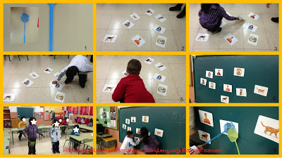 El juego lo hace para trabajar el vocabulario aprendido en la clase de inglés. Primero pone en el suelo el vocabulario que quiere trabajar, va llamando de uno en uno a l@s alumn@s y les va diciendo: buscame dónde está… y el niñ@ una vez que lo ha encontrado lo coloca en la pizarra. Luego se hacen dos equipos y se dividen a l@s niñ@s del aula, cada equipo tiene un “matamoscas” de un color. Entonces la profesora dice una palabra y los niñ@s van corriendo hasta la pizarra para “atrapar” la imagen de la palabra que les ha pedido la profesora.