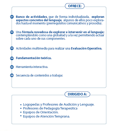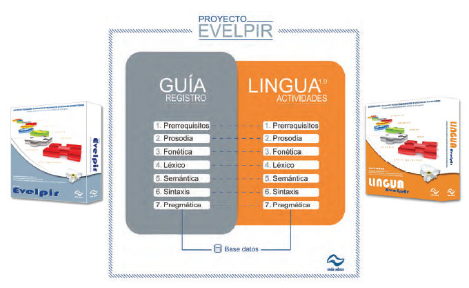 Ofrece un amplio banco de actividades multimedia con dinámicas diferenciadas, que nos permiten valorar los diferentes aspectos del lenguaje que la Guía Evelpir estructura en siete módulos: PRERREQUISITOS, PROSODIA, FONÉTICA, LÉXICO, SEMÁNTICA, SINTAXIS y PRAGMÁTICA.