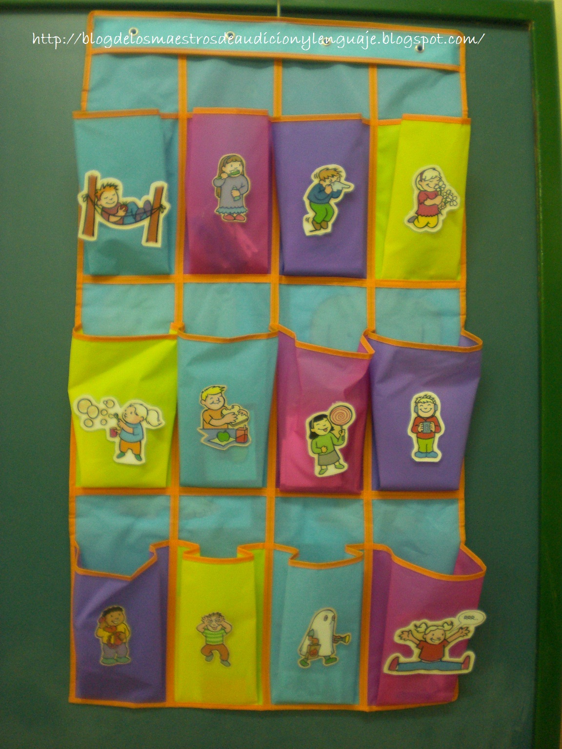 Este fue mi primer panel clasificador, lo hice hace varios años, es un clasificador de zapatos de colores, y puse los dibujos correspondientes a las actividades que realizo en los talleres de estimulación del lenguaje en Educación Infantil, pero también me sirve para utilizarlo a nivel individual o en pequeño grupo en mi aula, es muy práctico, dentro que cada apartado hay ejercicios para trabajar, por ejemplo, en praxias tengo pequeñas tarjetas de dibujos para trabajar la praxias, en el de audición los dibujo correspondientes al cd que tengo para trabajar la discrimiación auditiva, etc.