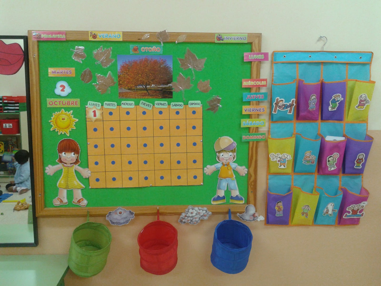 Además de pintarlo de verde, le he colocado unos pequeños ganchos para colgar tres dispensadores que compré en IKEA que me sirven para guardar las tarjetas con las imágenes del tiempo y del calendario. ¿Ha quedado bien vistoso verdad?