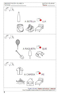 Os pongo el primer ejemplo con la solución. Se trata de quitar la sílaba que nos piden a la palabra modelo y buscar entre tres soluciones la correcta. Espero que os guste.