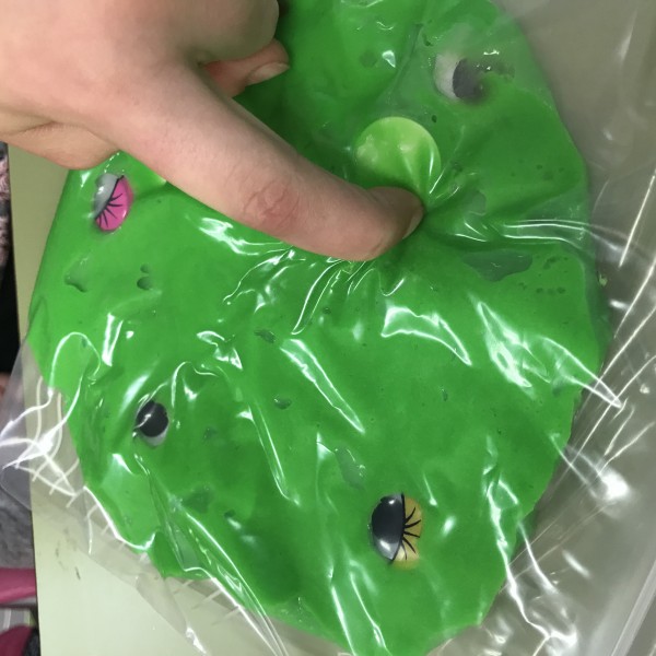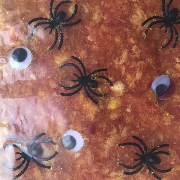 Hemos realizado dos masas sensoriales, una ya la conocéis, es el típico slime, pero le hemos añadido ojitos saltones de monstruos, jeje, y la otra ha sido una masa sensorial que hemos preparado con la celulosa de pañales, añadiéndole arañas para darle más efecto.