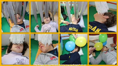 Además utilizamos dos elementos más, una fregona y unos globos. Tumbamos a los chicos en la alfombra de nuestro rincón sensorial, pusimos música de relajación de fondo, y procedimos a hacer masajes con nuestros materiales de ducha seca. A algunos les gustó más que a otros, pero se lo pasaron bien y se relajaron bastante.