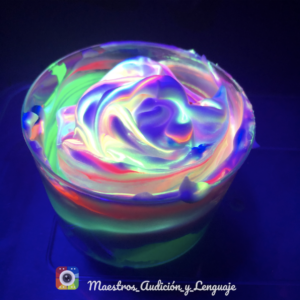 Y el procedimiento muy sencillo, sólo tenéis que poner la espuma en el recipiente, encima varios colores de pintura fluorescente, apagáis las luces, enfocáis la espuma con la linterna ultravioleta y vais moviendo para mezclar los colores, todo un espectáculo visual. Los peques se quedan encantado, y los no tan peques también 🙂