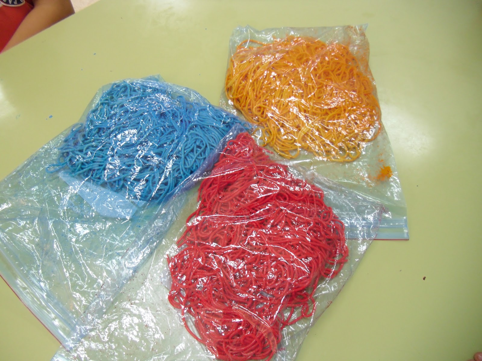 Y hoy hemos jugado en el TALLER MULTISENSORIAL ¡¡¡con spaguettis de colores!!! Lo vi el mes pasado en el BLOG EL SONIDO DE LA HIERBA AL CRECER, de ANABEL CORNAGO, y lo vi estupendo para mis talleres de la UEECO, y también han sido todo un éxito!!