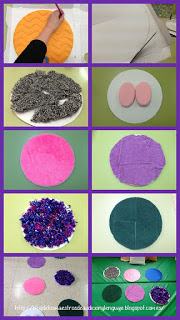 A continuación cortamos trozos de tela, las esponjas por la mitad, los estropajos, etc, y los vamos pegando a los círculos de cartón. Yo he usado cola de barra con la pistola selladora, si no tenéis podéis usar cualquier pegamento de contacto.