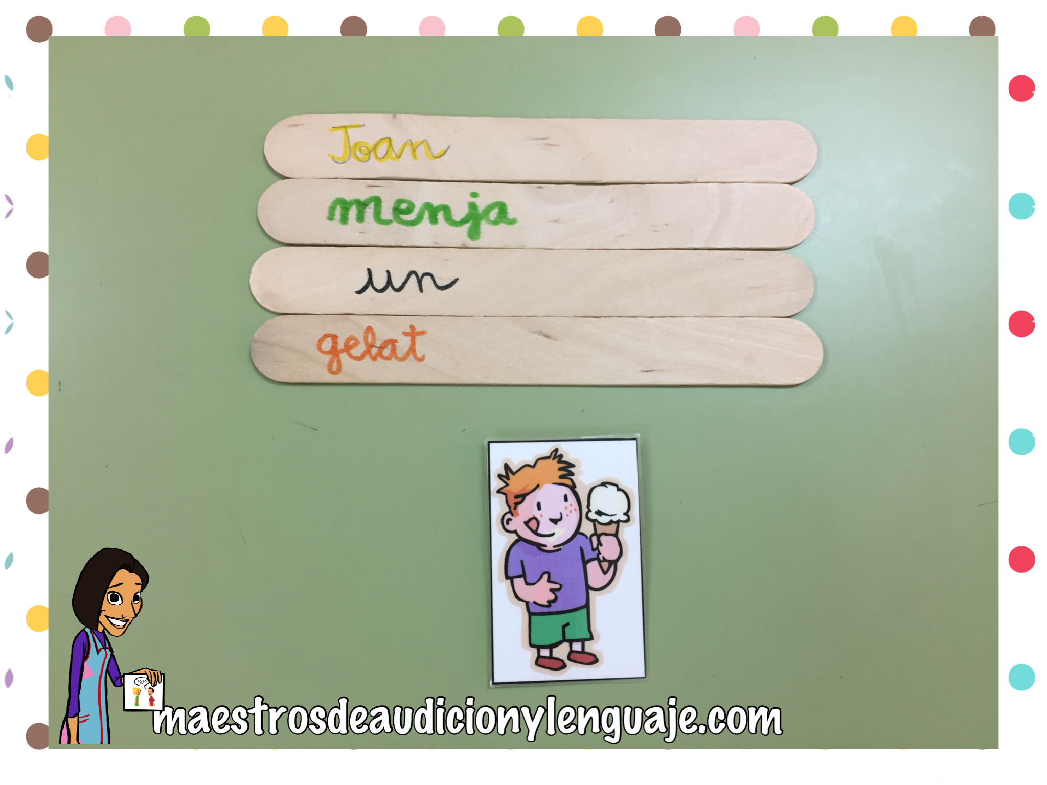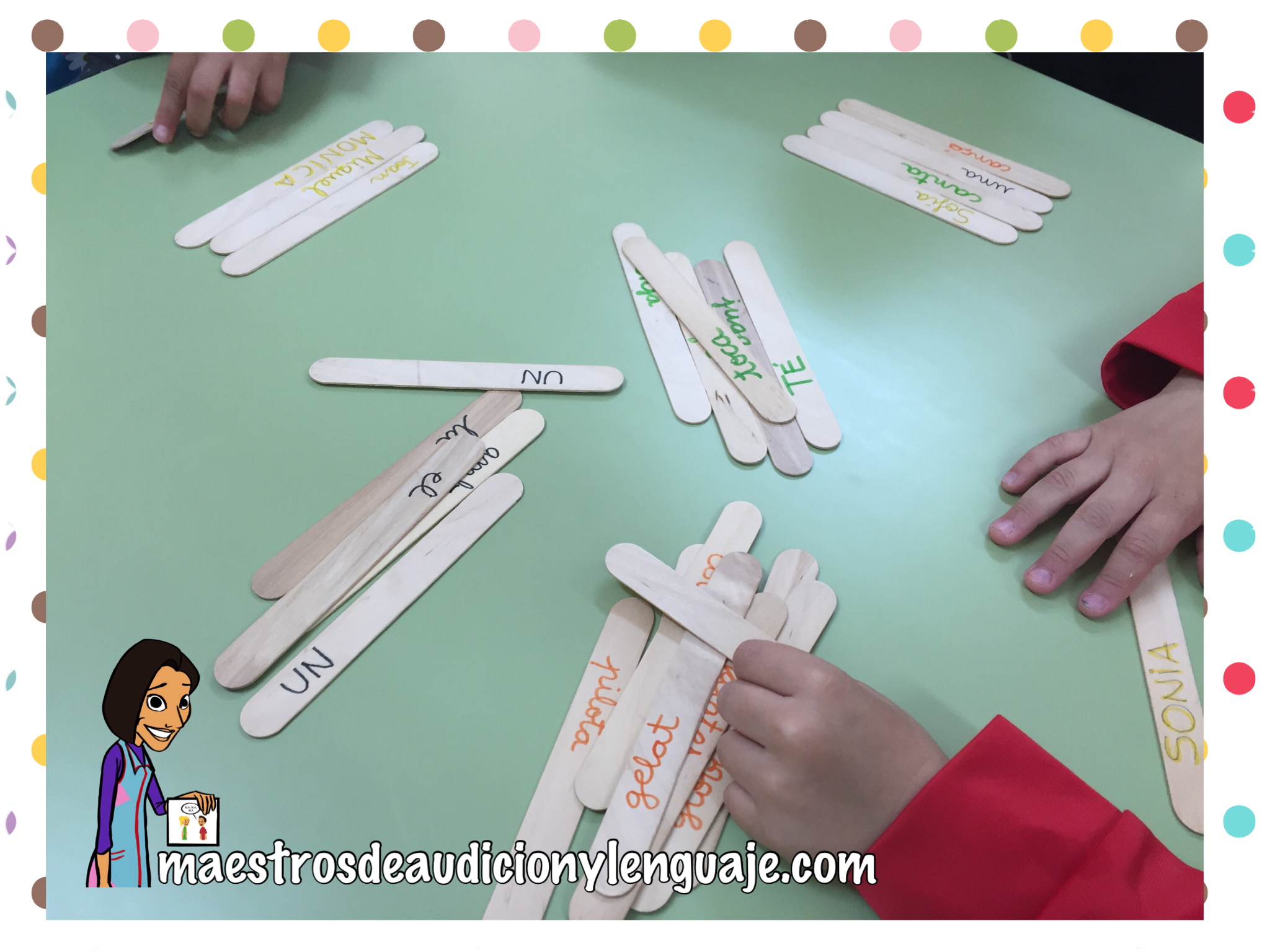 De momento juego de dos maneras: una en la que le doy al niño la frase con las palabras desordenadas, y las tiene que colocar en su orden. Y otra en la que el niño coge un depresor de cada categoría y luego intenta construir una frase, que muchas veces será absurda, pero así tiene que adivinar cómo debería ser la frase correcta.