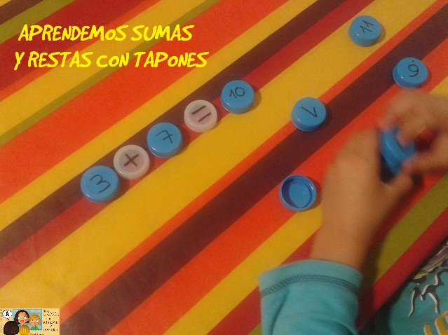 Hoy he improvisado un juego con mi hijo Daniel, he cogido tapones de plástico de botella (siempre los guardo para hacer juegos en el cole) y con un rotulador permanente le he escrito los números del 1 al 20 y luego los signos del + y del – para trabajar con él las sumas y las restas. Además hemos jugado a contar de dos en dos, luego yo le quitaba algunos tapones y él tenía que completar… le ha gustado tanto que luego él mismo se ha inventado el juego de meter los tapones en la caja encestándolos como si fuera un partido de baloncesto, jaja.