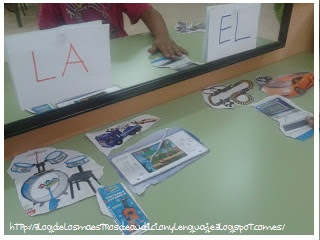 Luego hemos improvisado un juego de clasificación, colocando dos papelitos, uno con LA y el otro con EL, y entonces iba pidiendo que me dijera el artículo correspondiente. La verdad, nunca me había encontrado con un caso así, por mucho que lo trabajo no hay manera que espontáneamente ni con la repetición (a veces necesito hasta tres veces repetírselo) me diga el artículo sin omitir el fonema “l”. Seguiremos trabajando en ello y buscando nuevas fórmulas 🙂