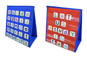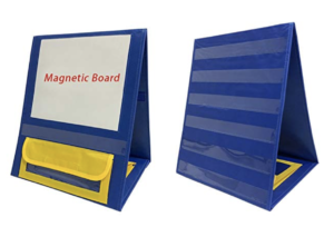 Es un soporte atril de doble cara, una con pizarra veleda imantada y otra con 6 filas de fundas transparentes y dos bolsillos para guardar letras o rotuladores.