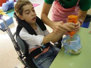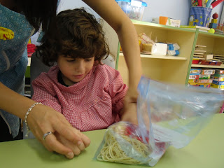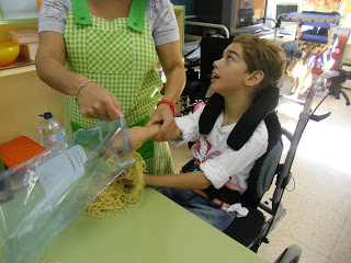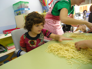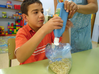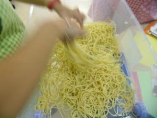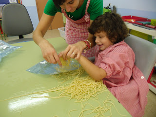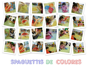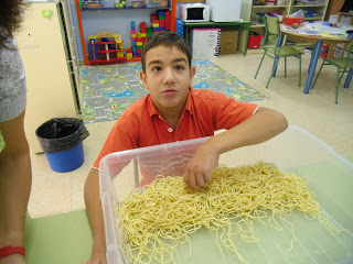 Y hoy hemos jugado en el TALLER MULTISENSORIAL ¡¡¡con spaguettis de colores!!! Lo vi el mes pasado en el BLOG EL SONIDO DE LA HIERBA AL CRECER, de ANABEL CORNAGO, y lo vi estupendo para mis talleres de la UEECO, y también han sido todo un éxito!!