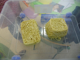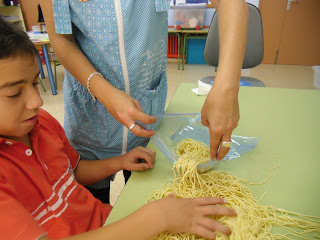 Primero de todo hemos traído de casa ya los spaguettis cocidos, con un poco de aceite para que no se pegasen. Los hemos sacado de sus recipientes y colocado en una caja de plástico; luego los hemos empezado a despegar.