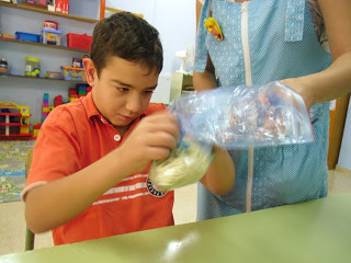 Y nos hemos preparado para amasar, chafar, palpar, tirar, jajaja, ha sido muy divertido, sobre todo las caras que ponían cuando iban cambiando de color